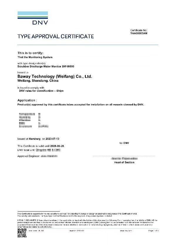 發(fā)布時(shí)間:2023-07-21 點(diǎn)擊量:34272023年7月1日,貝威科技有限公司成功獲得挪威船級(jí)社(DNV)頒發(fā)的型式認(rèn)可證書,成為中國首個(gè)獲得DNV認(rèn)可的脫硫塔洗滌水檢測(cè)儀制造商。該認(rèn)證標(biāo)志著中國制造的高端船舶檢測(cè)儀器儀表已達(dá)到國際先進(jìn)水平。