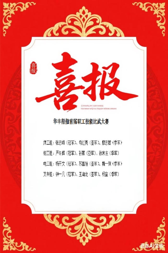 “這是技能的擂臺,更是成長的舞臺?!贝筚惖某晒εe辦,標志著華豐船舶在弘揚工匠精神、構建人才梯隊方面邁出堅實步伐。未來,公司將持續(xù)深化"干一行、愛一行、精一行"的企業(yè)文化,讓員工成長與企業(yè)發(fā)展戰(zhàn)略同頻共振,共同書寫高質(zhì)量發(fā)展新篇章!